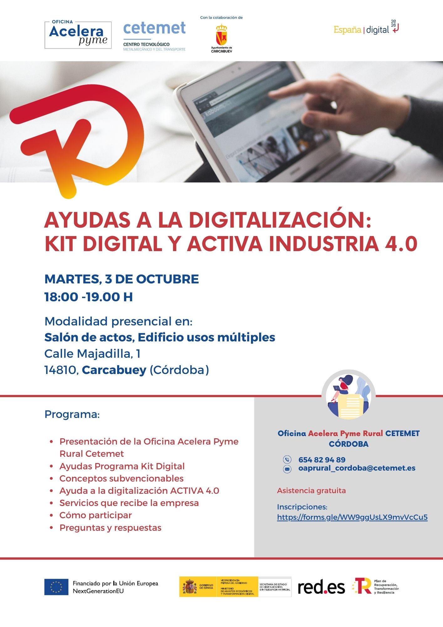 En esta jornada, organizada por la Oficina Acelera Pyme Rural Cetemet Córdoba en colaboración con el Ayuntamiento de Carcabuey, exploraremos las diversas ayudas disponibles para apoyar la digitalización de los negocios en entornos rurales.