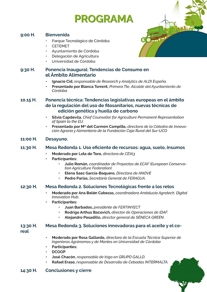 Durante las jornadas conoceremos las tendencias de consumo que rigen el mercado actual, desde el punto de vista de una de las cadenas de alimentación y supermercados más importantes del país, Aldi España. También se expondrán las tendencias legislativas europeas en el ámbito de la regulación del uso de fitosanitarios, nuevas técnicas de edición genética y huella de carbono. Y por último, se analizarán los retos y oportunidades desde el punto de vista de empresas innovadoras.